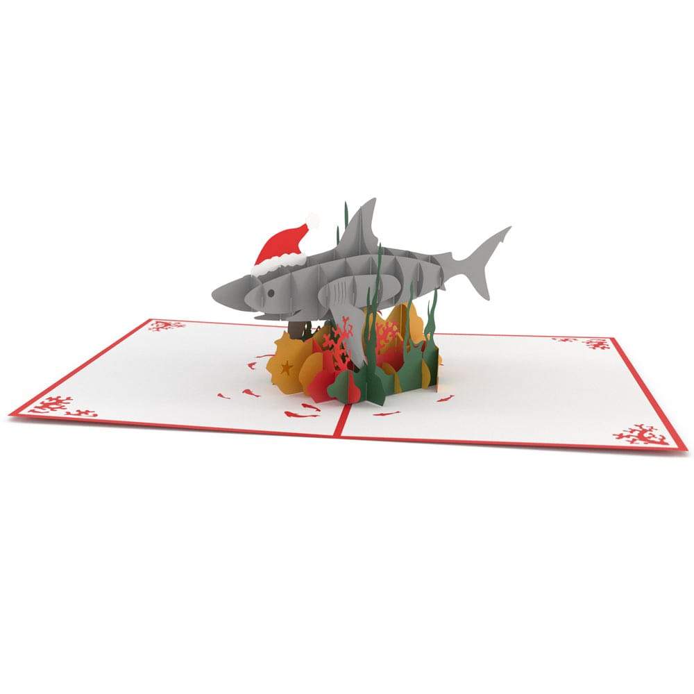 Once opened this amazing card reveals a three-dimensional and very festive shark wearing a Santa hat while swimming above a colorful coral reef. The outer corners of the card feature bright red coral reef designs and the base is surrounded by red fish embellishments.