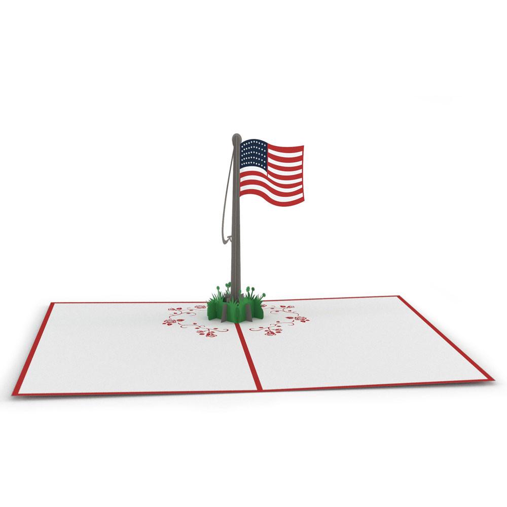 The front of this patriotic pop-up card shows the stars and stripes in a ribbon of streamers. Open the red card to find Old Glory flying high atop the flag pole. Flowers decorate the base of the flag pole while the rest of the card remains blank.