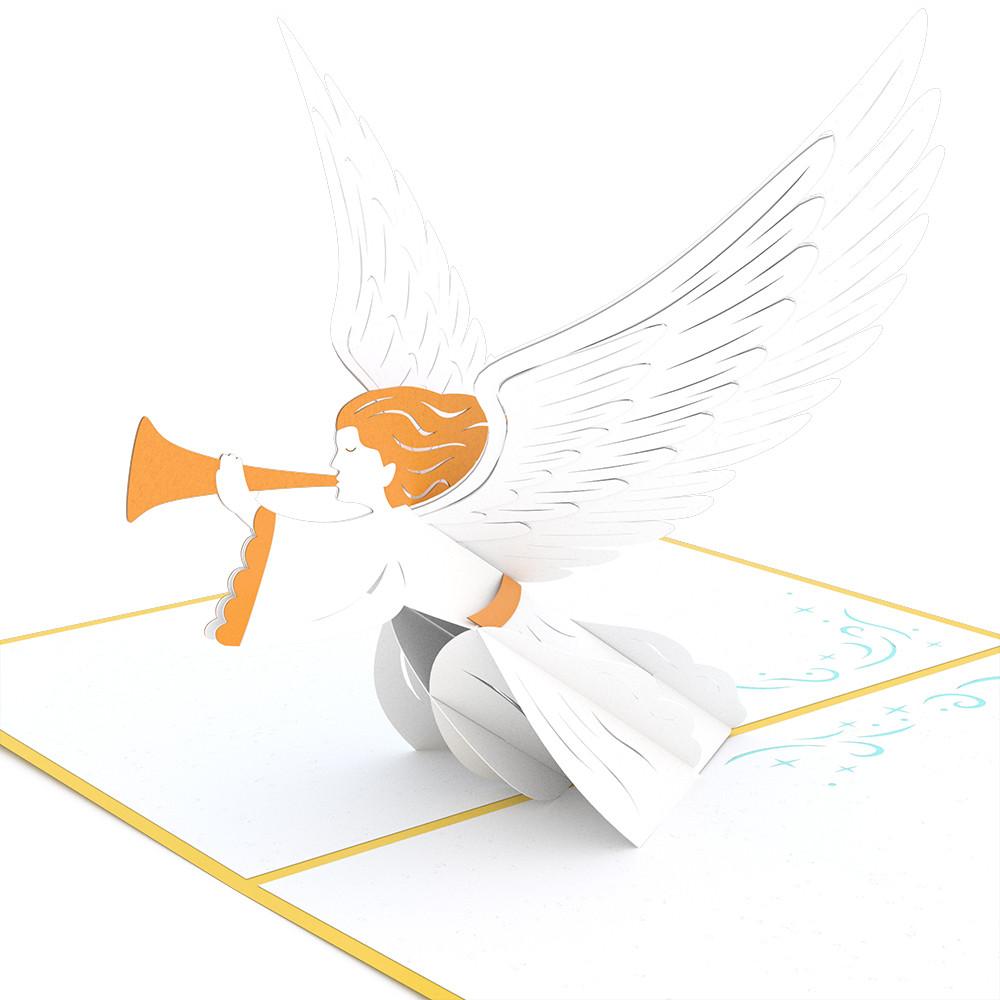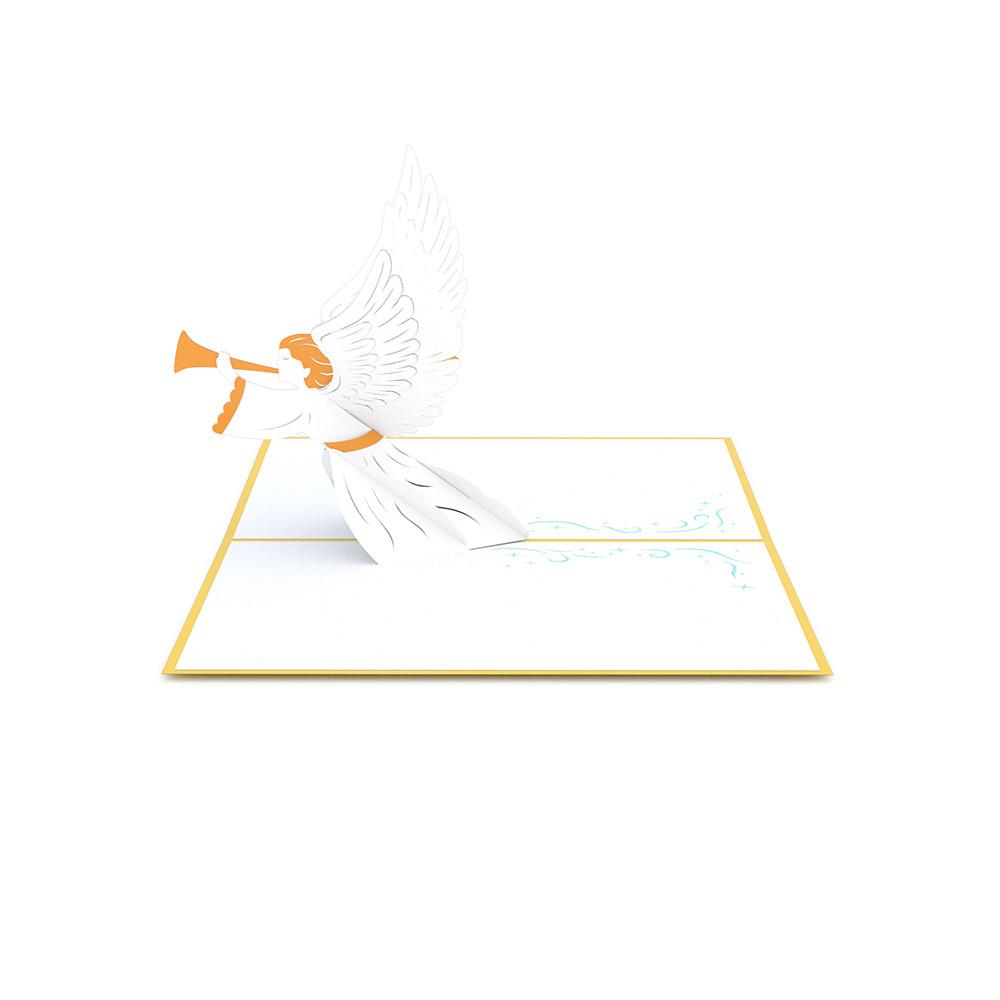 Inside the pop up card is a 3D Christmas Angel blowing a trumpet. The angel's wings are full of many intricate details and are outstretched. Elegant and dramatic, the Angel pop up card will take a recipient's breath away upon opening.