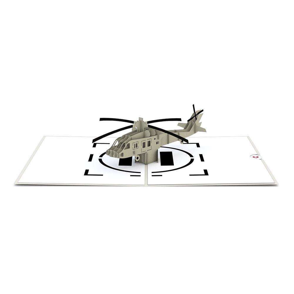 This card was created because quite frankly we think it is super cool. We wanted to provide a unique pop-up card option for members of the military, pilots, technicians, and anyone who appreciates the form and function of the versatile and rugged Black Hawk Helicopter.