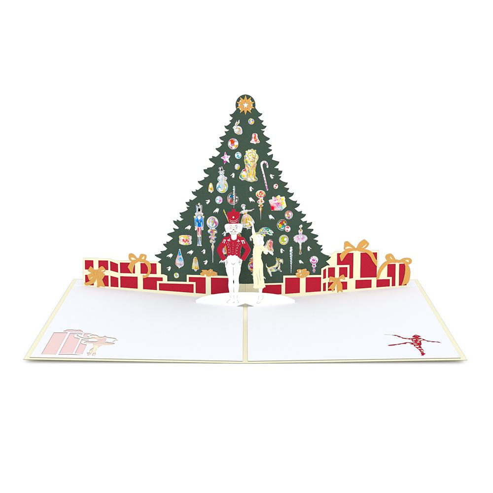 Inside The Nutcracker card, a large Christmas tree stands tall with many festive and colorful ornaments. At the base of the tree, red presents of all sizes are all lined up next to one another. In front of the tree and gifts, The Nutcracker Prince and Clara stand tall with the ballerina and harlequin dancers laser-cut on both front corners.
