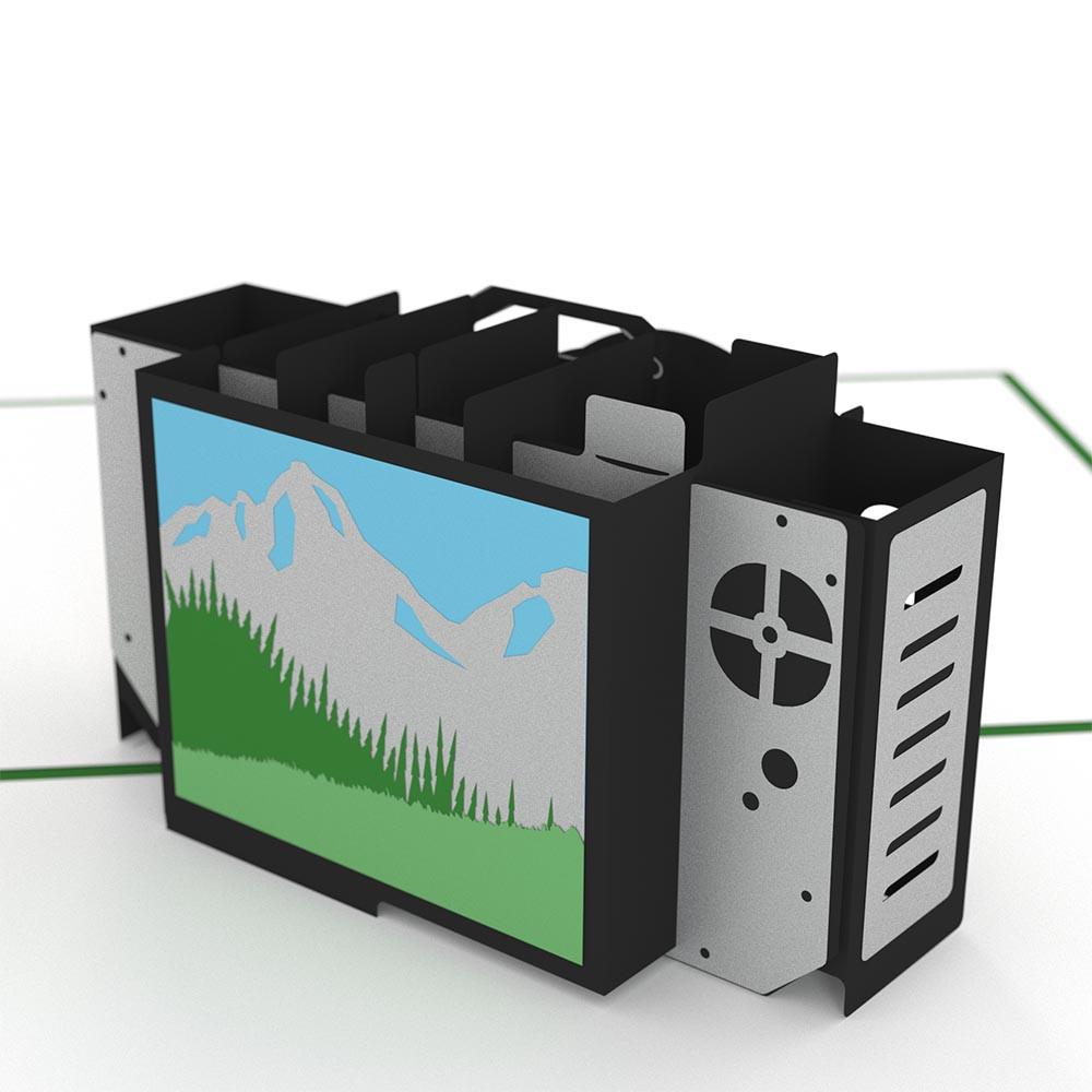 Once opened this card reveals a 3D pop-up camera full of fun details including a laser-cut lens. Turn the card around, and the back of the pop up camera mirrors the scene depicted on the cover in spectacular color. The majestic mountain range and greenery composition are illustrated clearly for the photographer to see in the view screen.