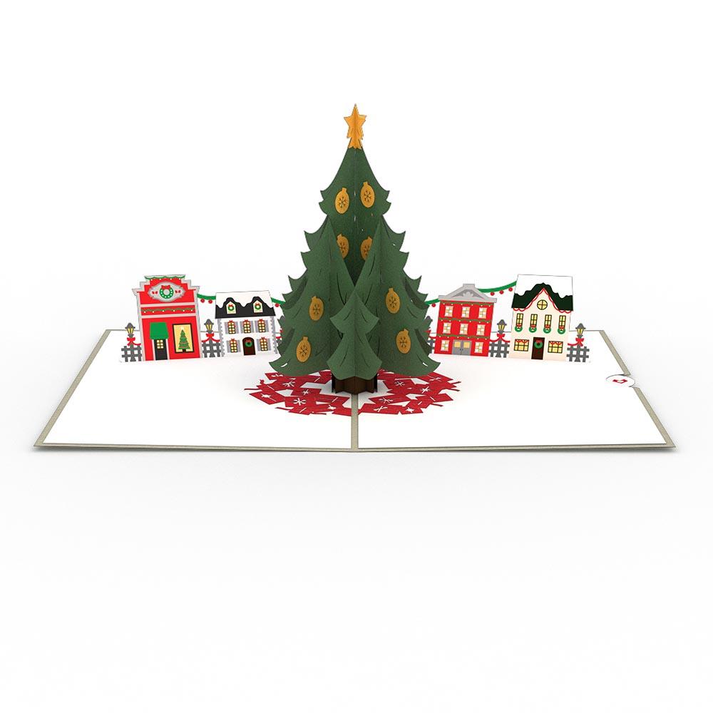 Once opened a Christmas Village emerges from the center of the pop up card. A beautifully decorated Christmas Tree is at the center and is surrounded by wrapped Christmas presents. Beautifully detailed and reminiscent of collectible ceramic Christmas villages, this pop-up card is breathtaking.
