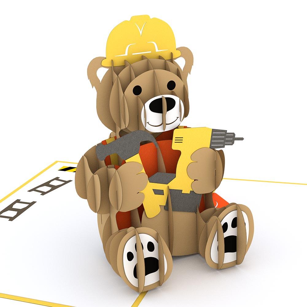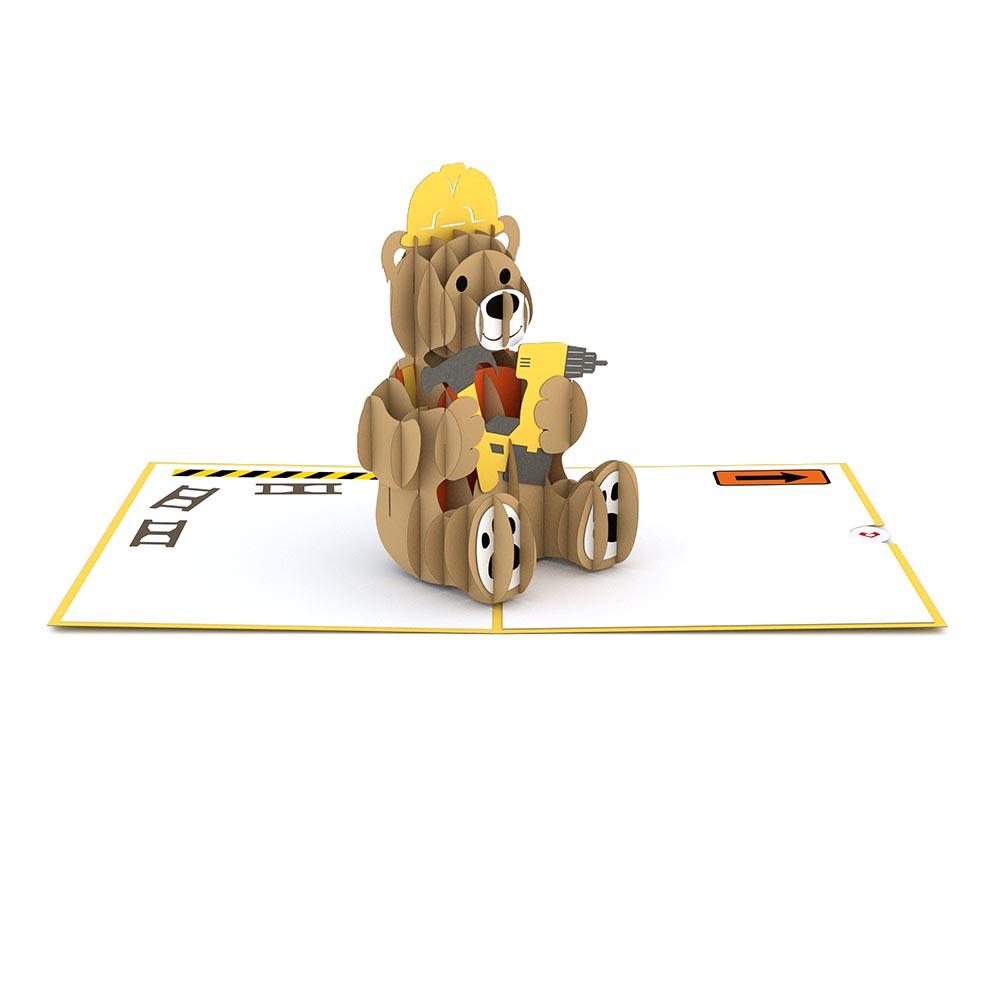 Once opened a 3D pop up construction bear emerges from the greeting card. The teddy bear is dressed in a hard hat and orange safety vest and is holding a power drill and hammer.