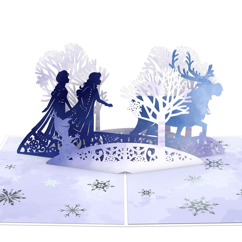 Elsa's signature snowflake adorns the shimmery white cover of this pop-up design. Upon opening, Anna, Elsa, Olaf, and Sven appear ready to embark on an incredible mythic journey through the enchanted forest. Their blue-toned silhouettes stand out against the lavender-colored snow. The inner panels of this design feature metallic silver snowflakes, adding to the overall magic.