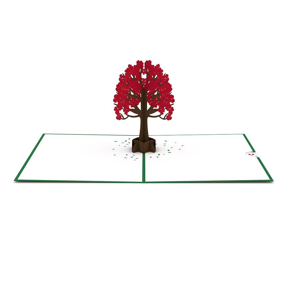Open the Dogwood Tree Card to find a pop up of a fully blossomed red dogwood tree. The branches of the tree support red flowers on all sides. Dogwood flowers and hearts intertwine to create the embellishments that outline the blank card.