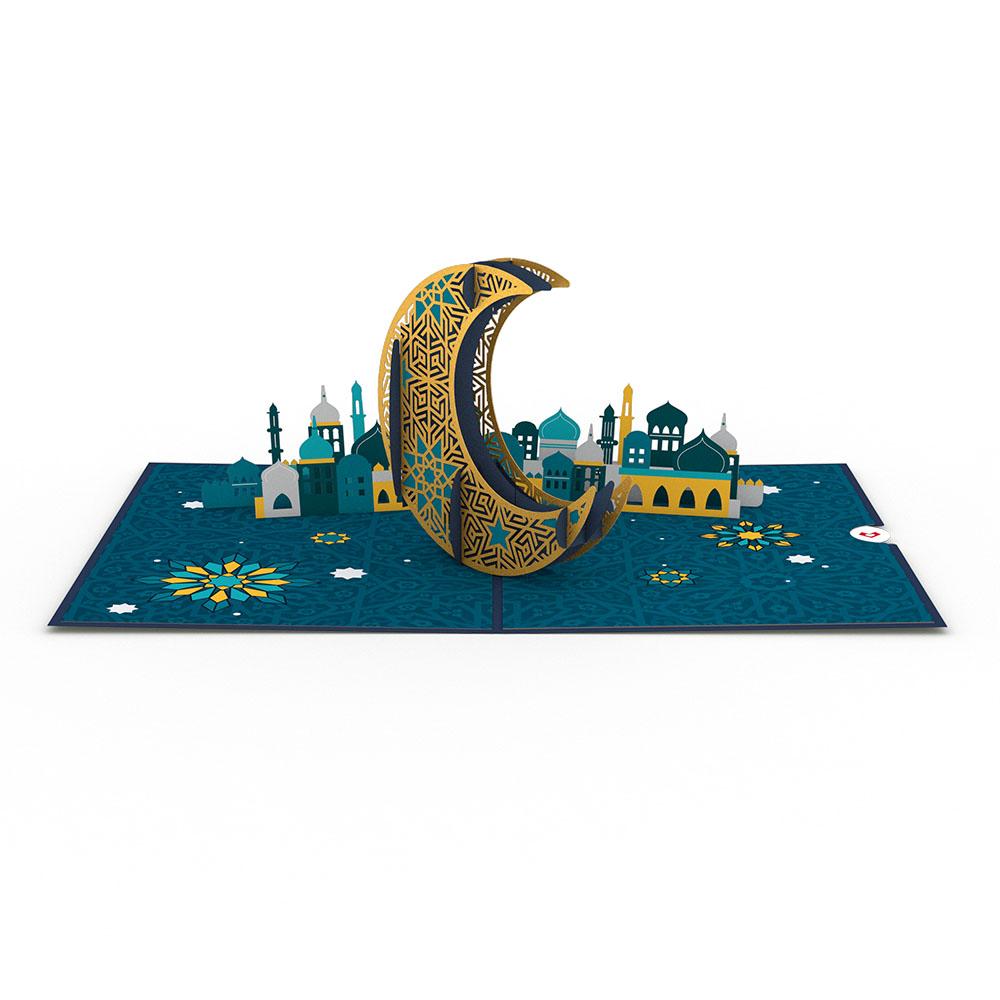 The navy cover of this pop-up card features a white crescent moon joined by intricate yellow and blue star and lantern designs. Upon opening this design, a golden crescent moon pops up, beautifully laser cut with geometric star patterns. The background features a spectacular city scene, displayed on the elegant yet subtle surrounding teal design.