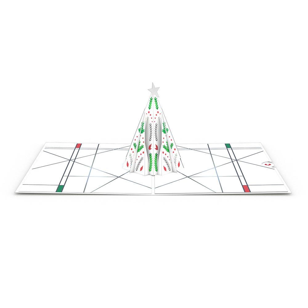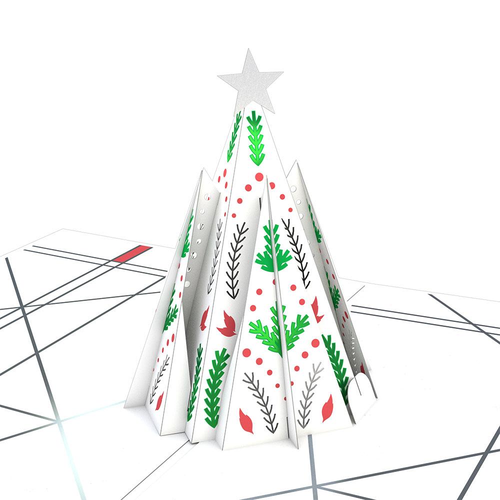 An elegant white Christmas tree adorns the cover of this pop-up card, decorated with red and green designs, and a silver star. Upon opening, the white Christmas tree appears, styled with emerald branches, ruby leaves and dots, and a shining silver star on top. The inner panels of this design showcase a modern and geometric pattern of silver lines.