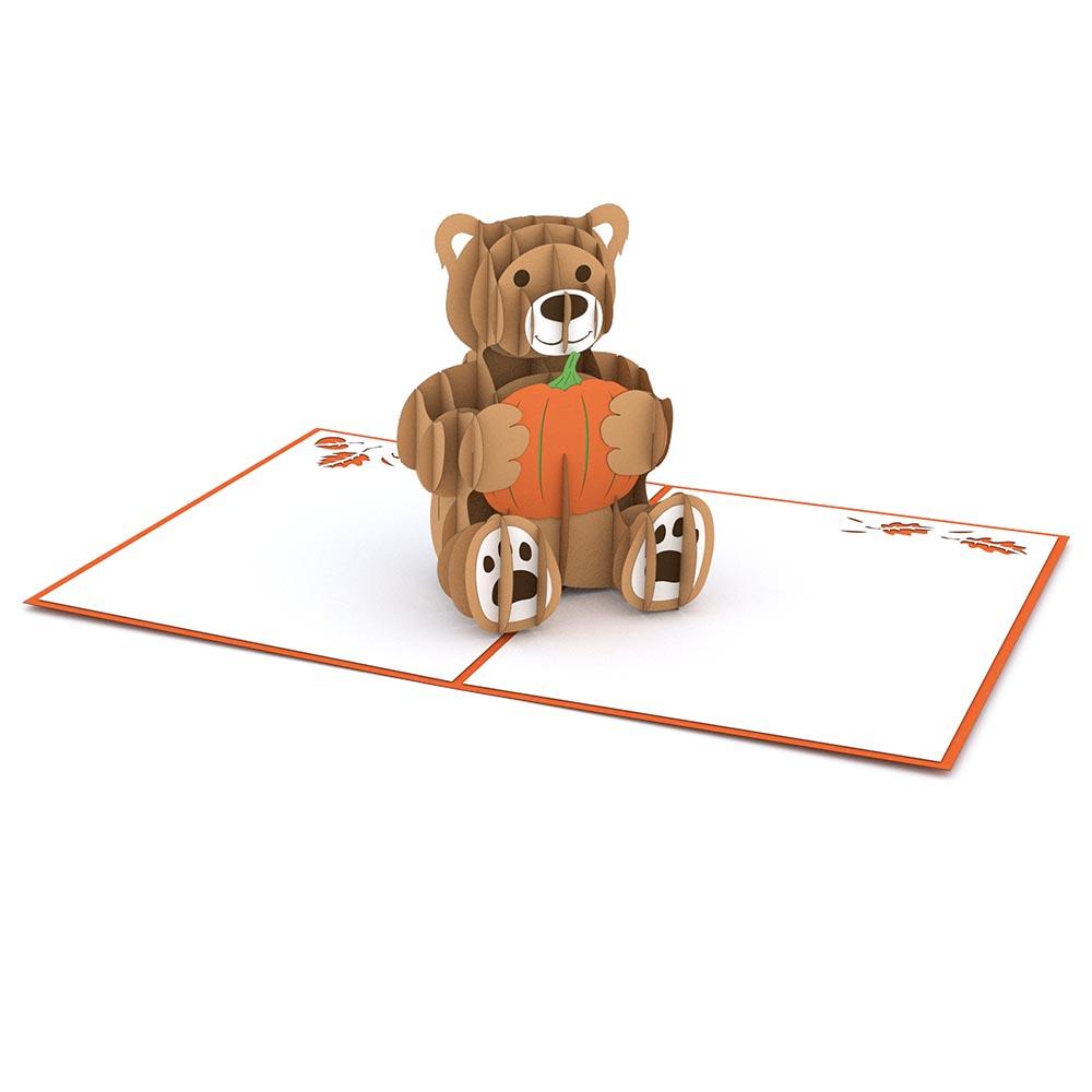 The front of this lovable Fall Bear pop up card features an adorable teddy bear surrounded by a few fallen leaves. Open the orange card and watch Teddy and his favorite pumpkin pop up and come to life.
