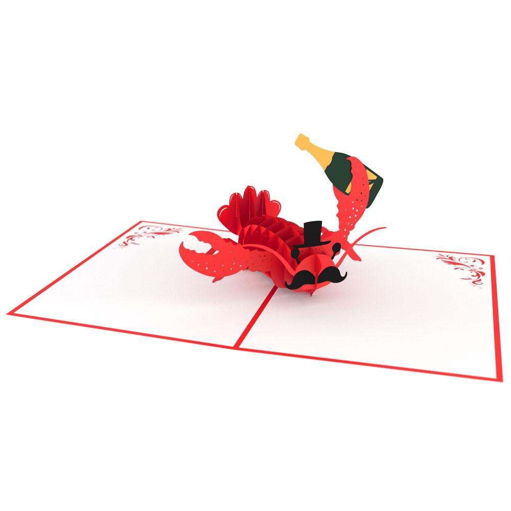 Once opened the card reveals a charming pop-up surprise: a bright red lobster decorated with a top hat and mustache. He's ready for any celebration with a festive champagne bottle in claw.