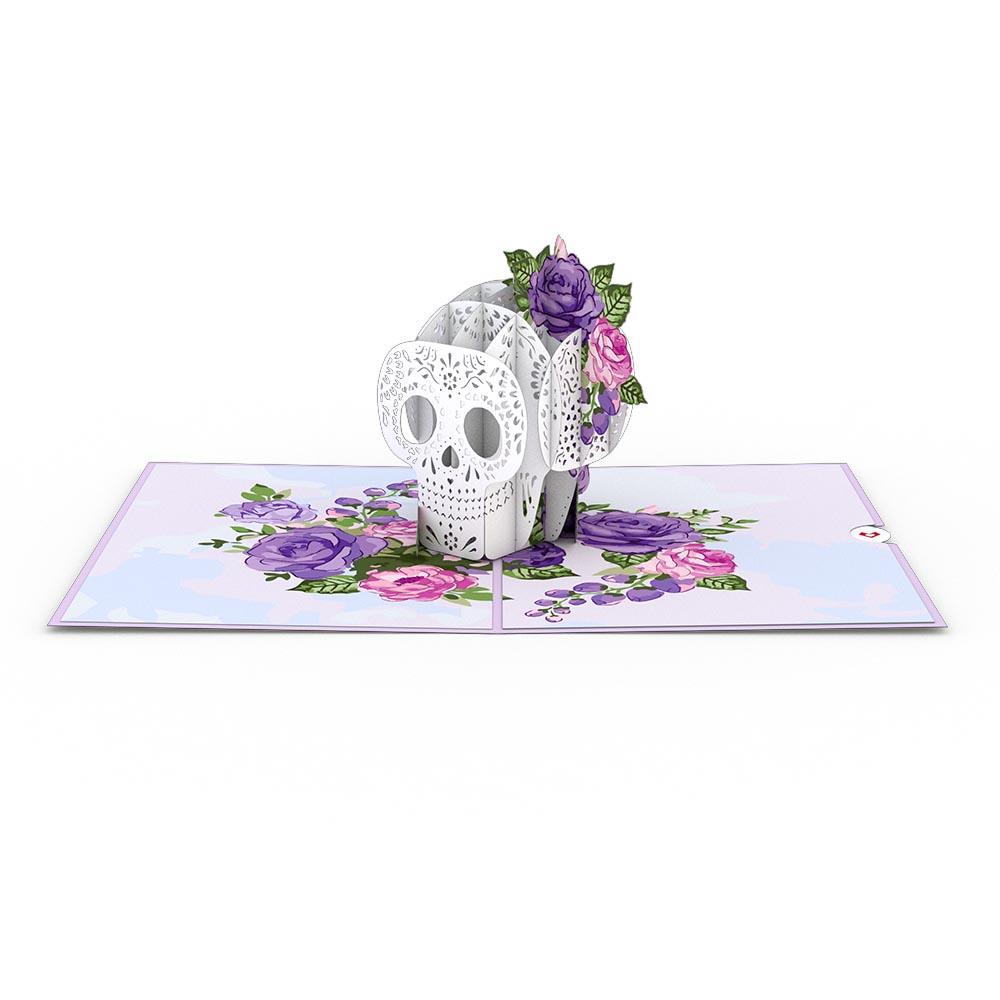 An intricately laser-cut skull wearing a purple and pink flower crown decorates the front of this lavender pop-up card. Upon opening, an ornate white skull appears with beautiful floral embellishments cascading down the side. The pastel inner panels of this design feature elegantly illustrated pink and purple flowers with vibrant green leaves.