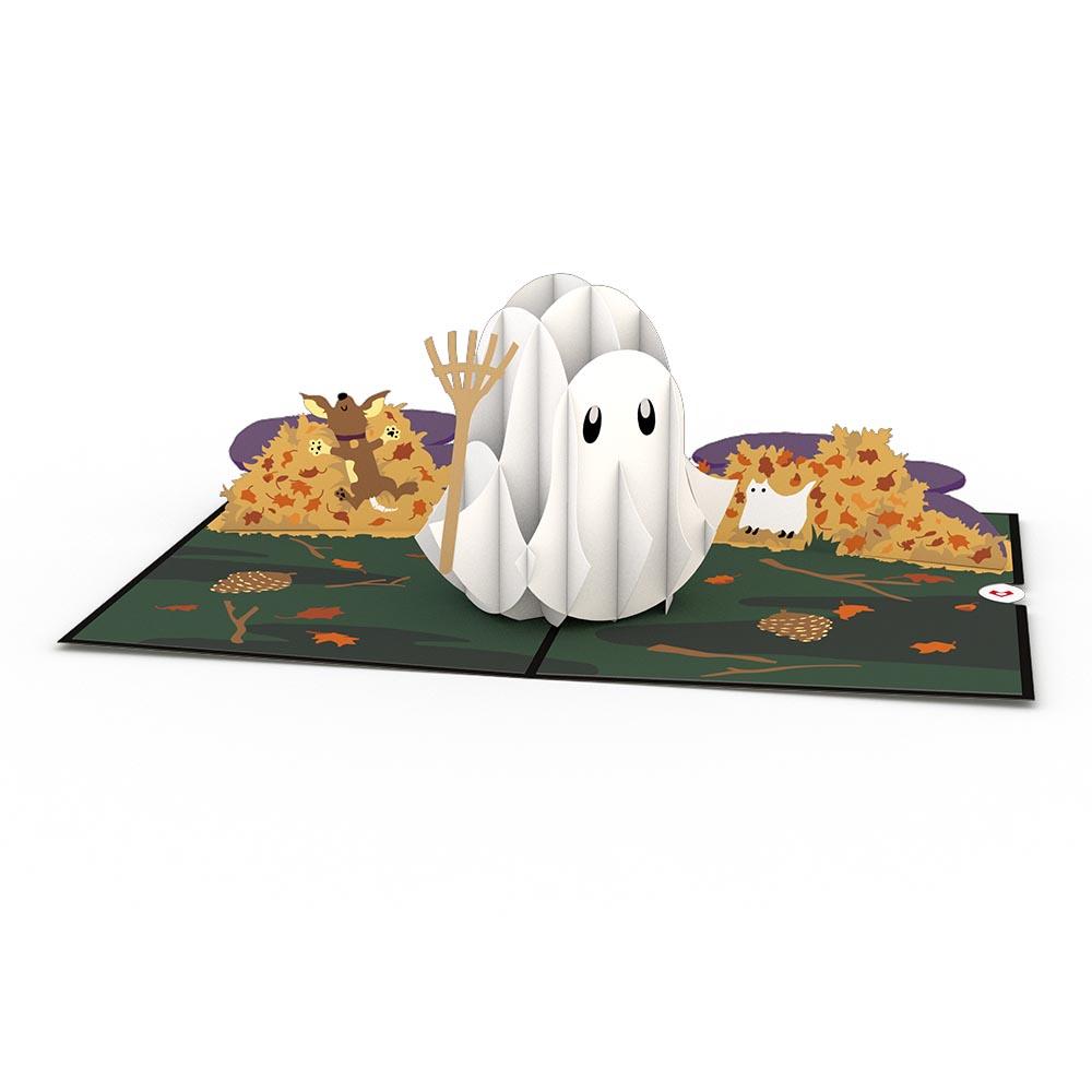 Our sweet spectral Ghost is wide-eyed with whimsy on the front of this matte black card. Inside, the cute Ghost — round and ever-so-friendly — holds a rake, ready to clean up his yard, scattered with acorns and fallen leaves across this vividly illustrated background. Behind him, his pop-up yardwork becomes the playground for his furry friends (ghost cat and ghost pup), as they transform into their Halloween alter egos just like their owner.