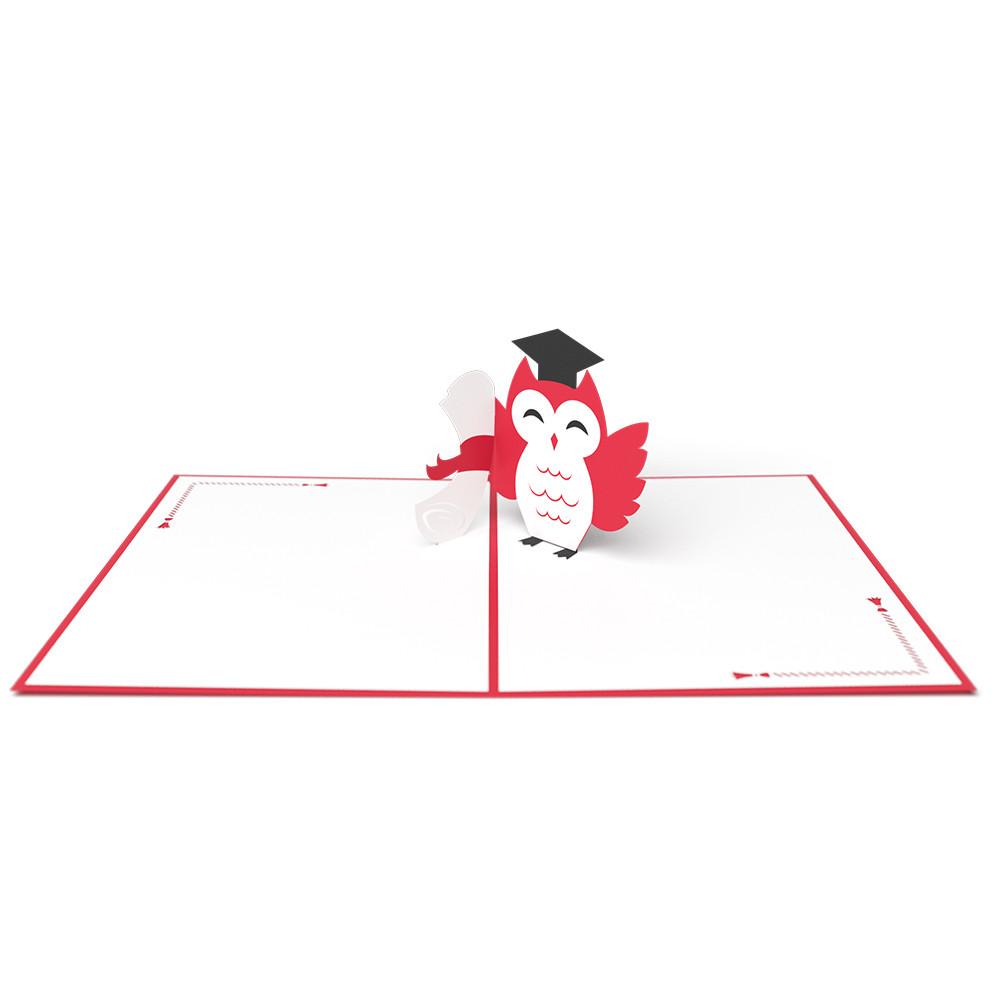 This red pop up card proclaims “Congrats!” on the cover. Upon opening the recipient is sure to smile when the graduation owl pops up out of the card with it’s diploma in hand. Check out the owl’s cap!