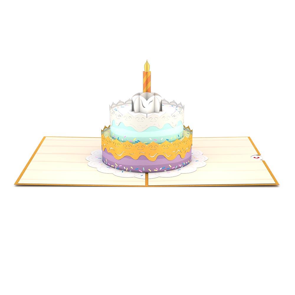 Our new Happy Birthday Cake design is sprinkled and spectacular with a bright metallic gold cover and a vibrant multi-layer laser cut cake. Once popped open, our 3D three-tier pastel confectionary creation emerges against a simply striped background. A single candle sits alight at the top — ready for a wish.