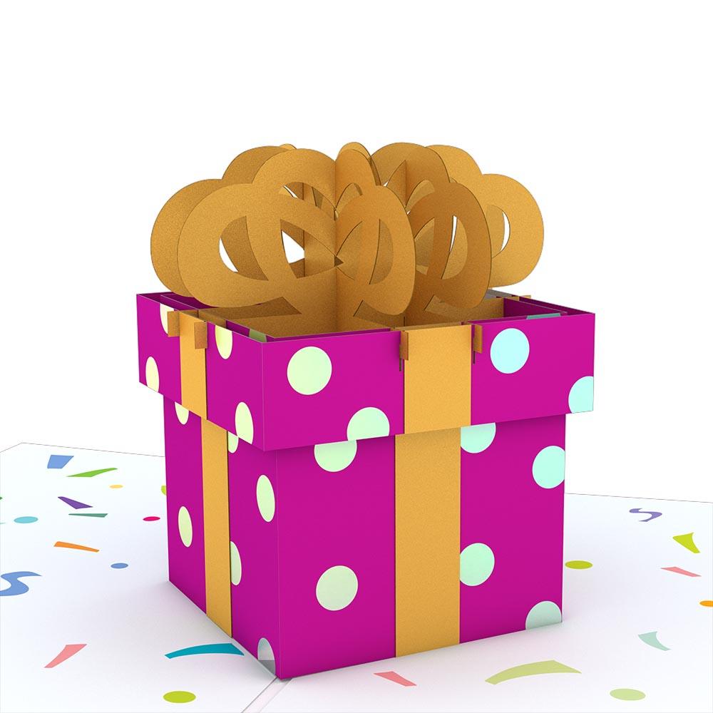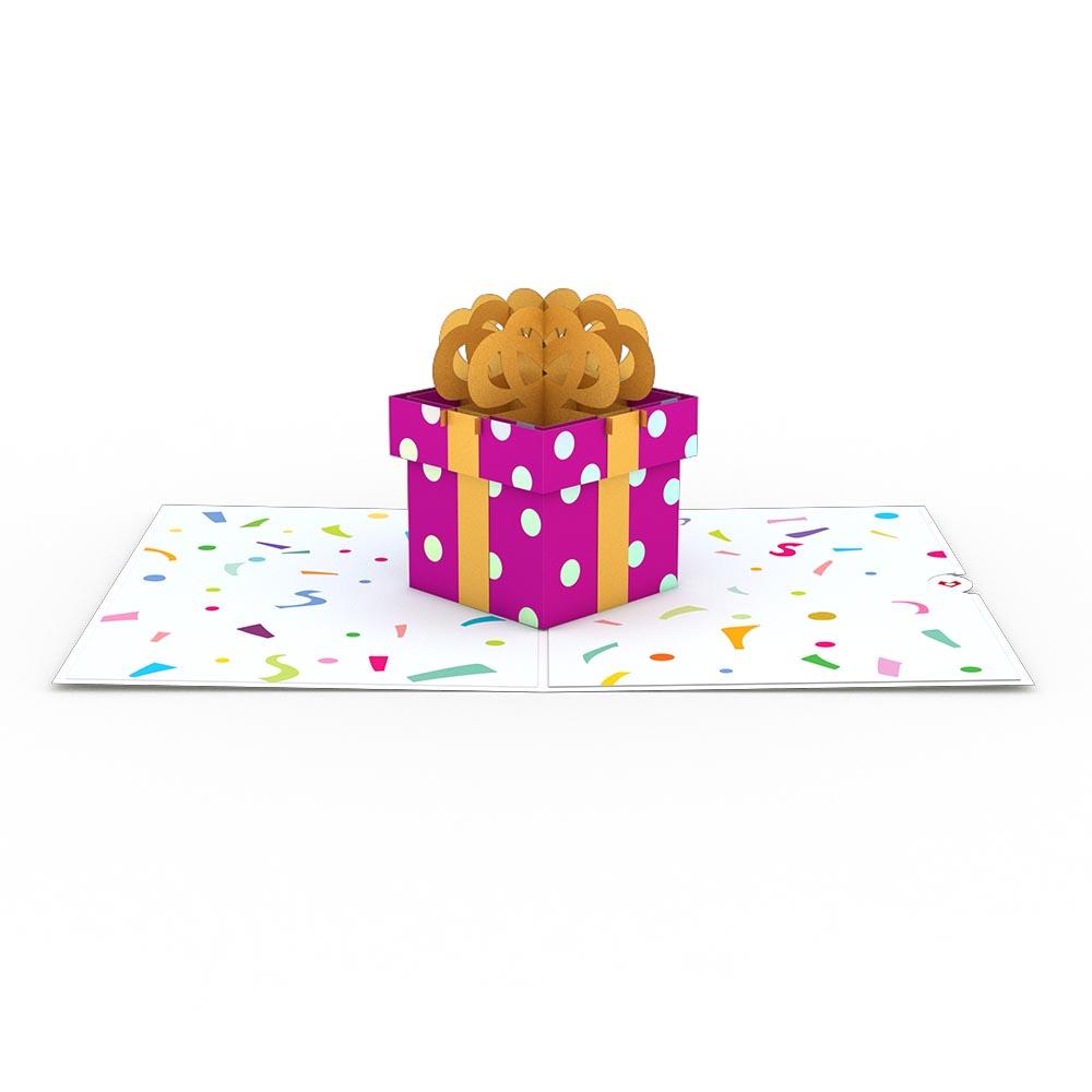 "Happy Birthday" is written on the cover of this celebratory design. Surprise your coworker with a birthday surprise without the confetti mess. Wish your favorite cousin a very happy birthday from near or far. Celebrate your mom's special day with a pink polka-dotted present she'll cherish.