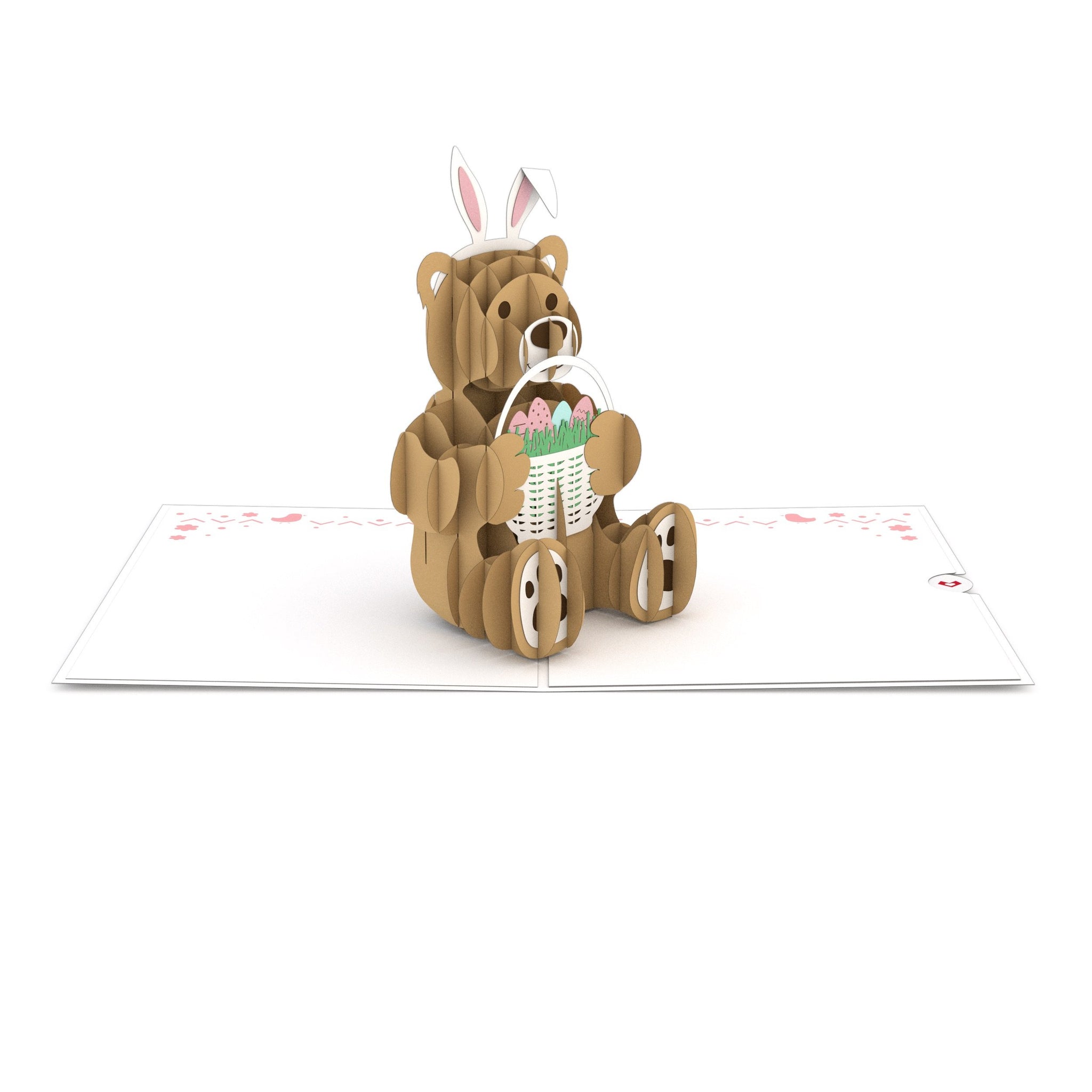 The white front of this pop up card features a brightly colored "Happy Easter" message. Inside, a light brown teddy bear pops up holding onto a white Easter egg-filled basket. The teddy bear is wearing a set of white bunny ears and smiling, ready for an Easter celebration to begin! Pastel pink springtime patterns embellish the top corners of this card.