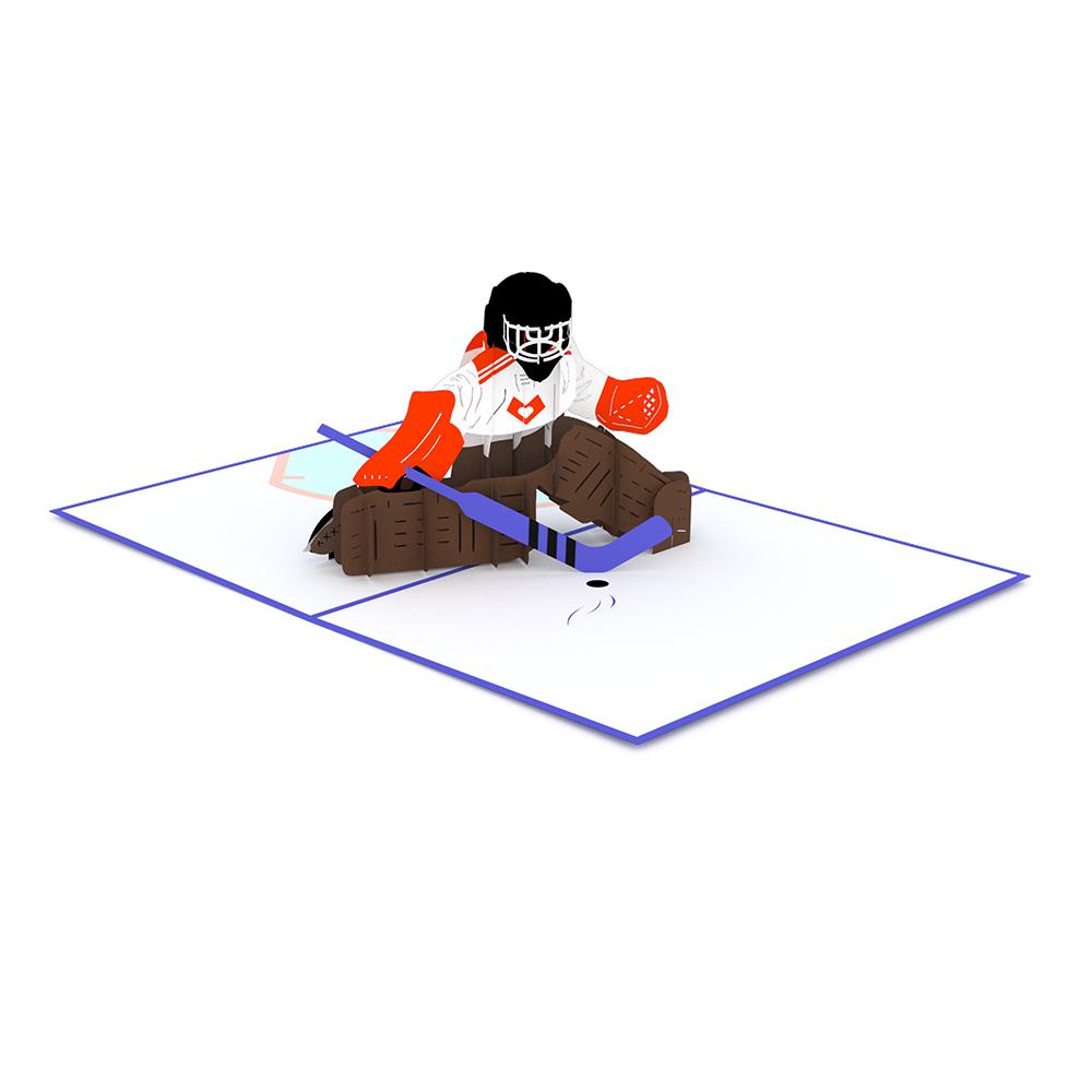 The Hockey Player pop up features a laser-cut blue cover with an illustration of a black goalie mask with a white cage.