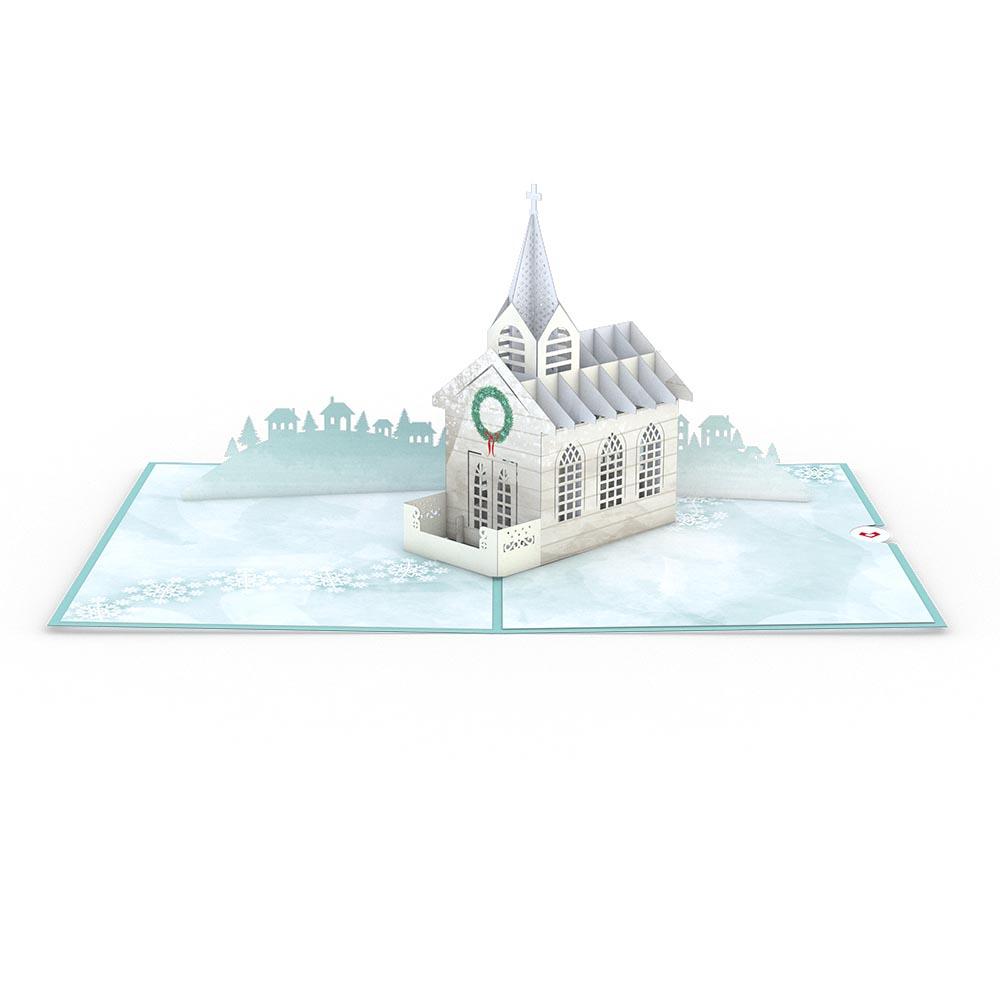 The teal front cover of this pop-up card features a circular window looking out into a wintery scene, with the message "Joy to The World." Upon opening, a beautiful chapel appears amidst a snowy landscape, decorated with a green wreath and red bow. A quaint nearby town can be seen in the background of this design.