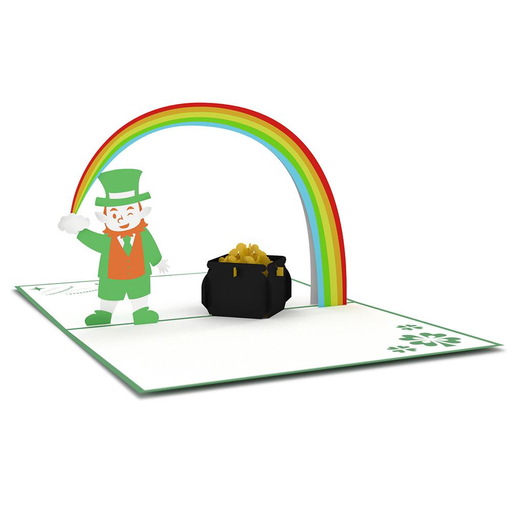 The front of this fun St. Patrick's Day greeting card features a magical pot of gold at the end of a rainbow. Open it up to reveal a mischievous leprechaun at the source of the rainbow with a dazzling 3D pot of gold. The inner corners of the card are embellished with shiny gold coins and four-leaf clovers.