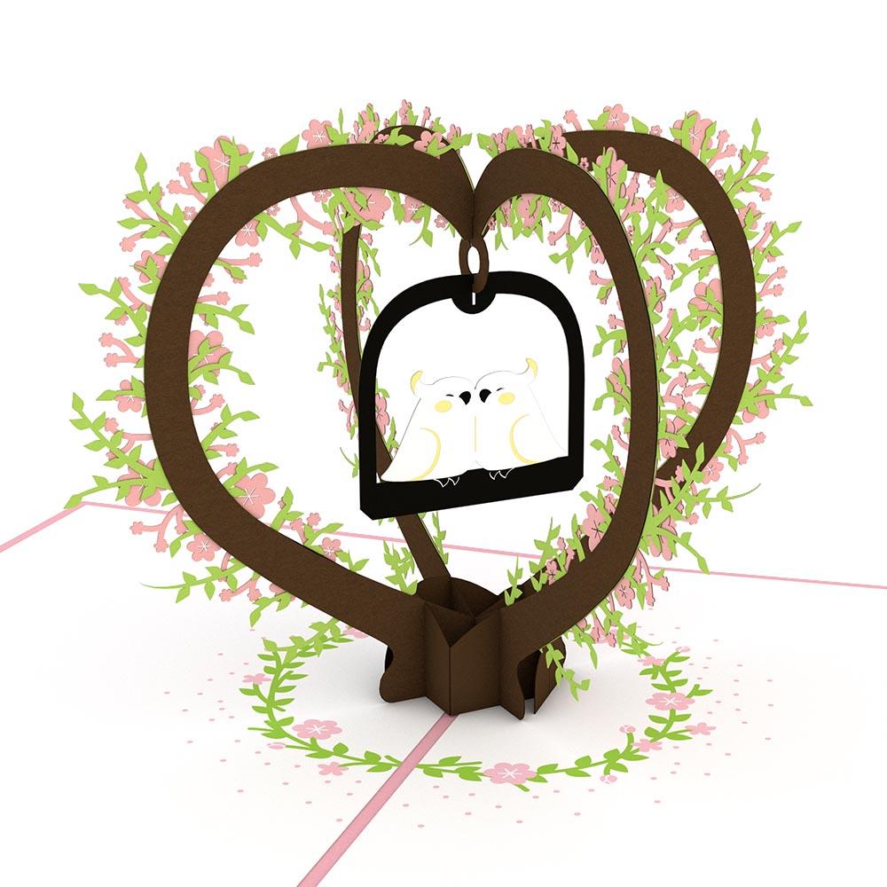 Open this captivating Valentine's Day card to reveal a breathtaking sight. Two lovebirds smooching while perched on a swing inside of a gorgeous heart shaped sculpture with intricate floral details. The outer corners of this Valentine's Day card feature lovely floral embellishments.