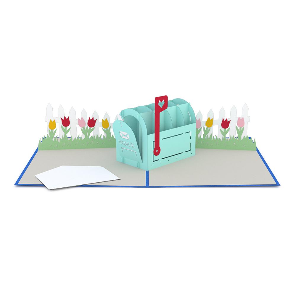 Inside the Mailbox card, a light blue mailbox is shown slightly ajar with a red flag upright on its side. In the background, there is a white-picket fence with beautiful flowers in front. If you check inside the mailbox, you might just find a surprise.