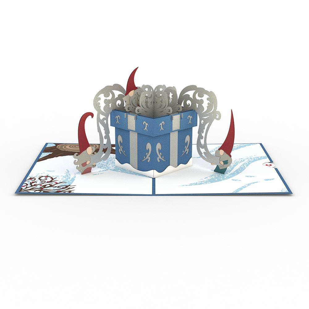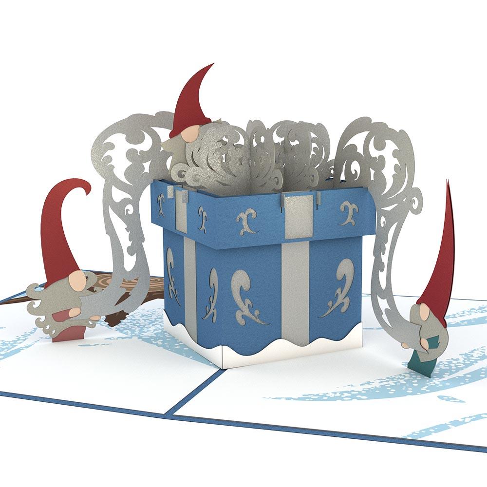 Wrapped in a big red bow, a tiny bearded gnome stands on the font of this laser-cut royal blue card. Inside, he and his mates don tall red hats and spring to life, teaming up to tie a bow onto a giant 3D present sculpture. The blue and silver parcel features intricately sliced filigree and flourishes, with an extravagant silver ribbon bow on top. They are surrounded by a vividly illustrated backdrop of snow-covered grounds and berry-filled brambles peeking along the edge.