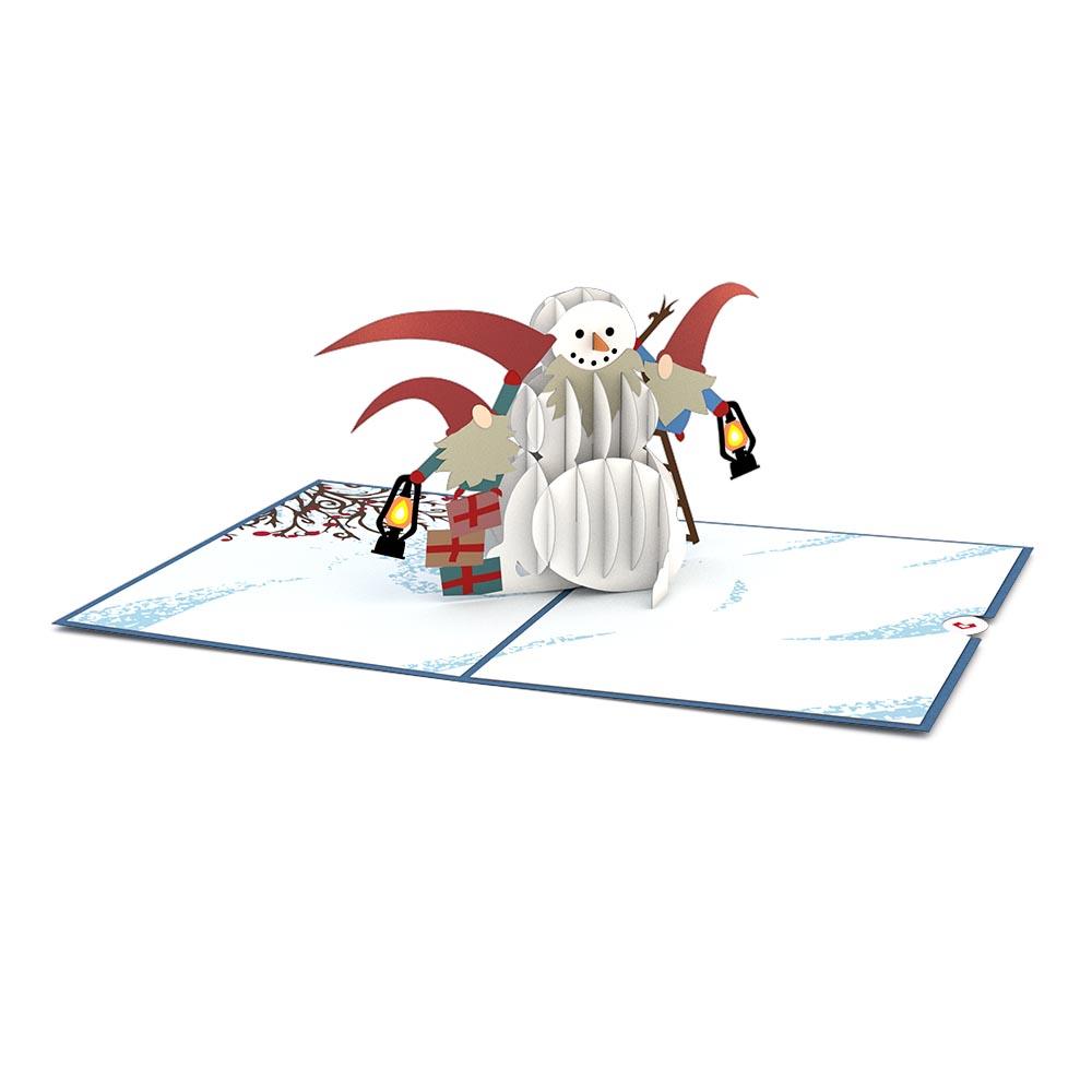 A laser-cut snowman with a spike-shaped beard, tall red hat, and carrot nose stands happily on the front of this royal blue card. Inside, its makers are revealed in splendid 3D. Dressing a snowman in their likeness, two lantern-carrying gnomes — with spike-shaped beards and garnet red hats — lean over ladders and present stacks to dress their creation for the holidays. The colorful pop-up scene is set against snowy white grounds with a bramble of ruby berries peeking across the upper left corner.