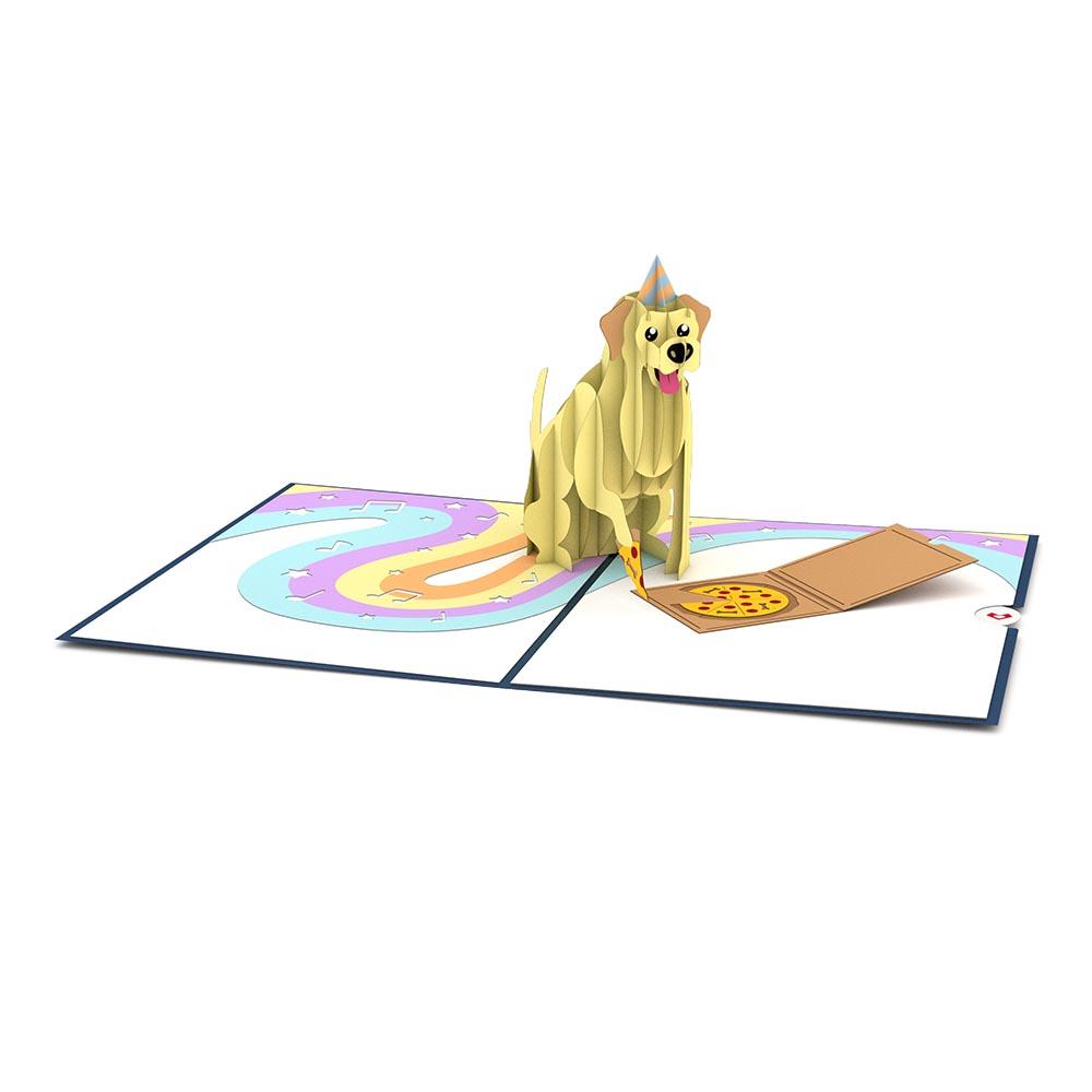 Once opened, the card reveals the yellow Party Dog with its blue and orange party hat. The dog is ready to chow down as it takes a slice of pepperoni pizza from the pizza pie in front of it. Along the inner panels, a swirly rainbow of blue, purple, yellow, and orange with star and music cut-outs cover the card. On the right side, the Lovepop notch note is shown ready to reveal the giver's message.