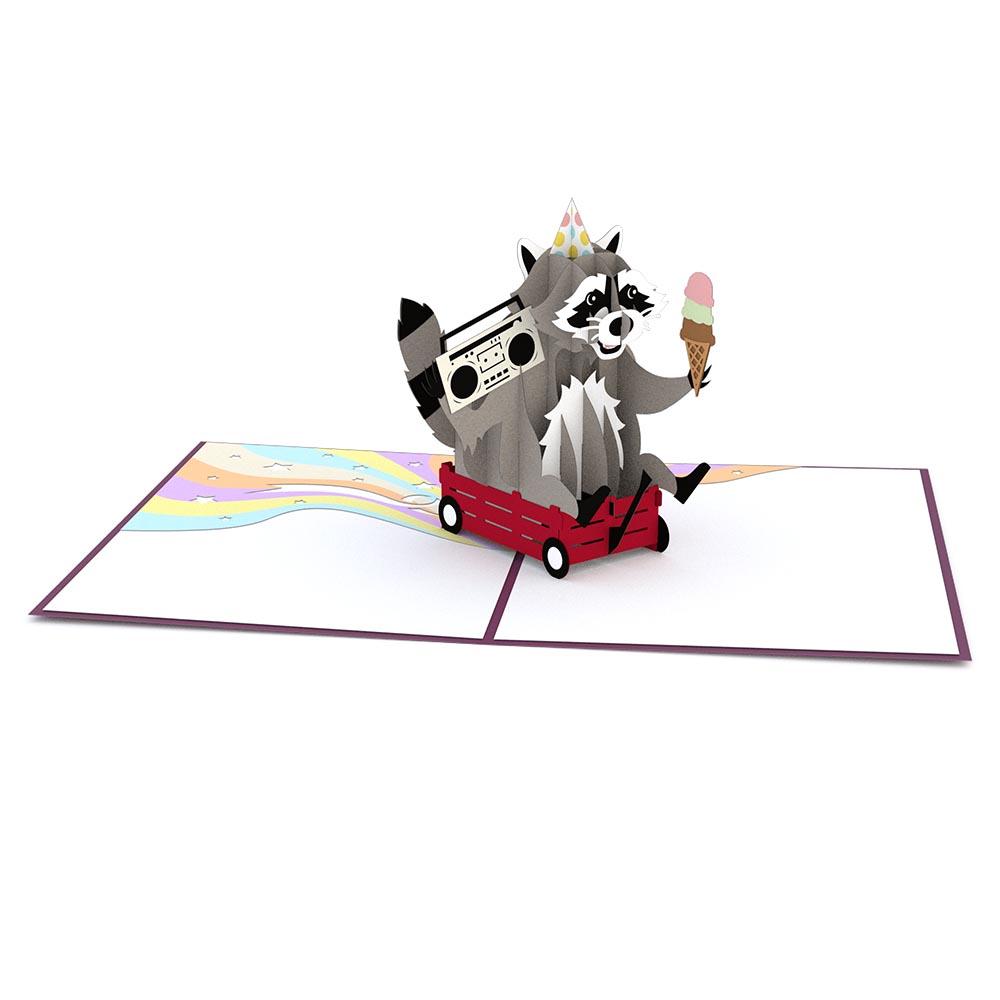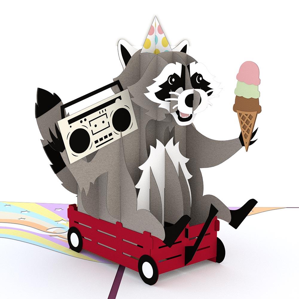 Once you open up the Party Raccoon card, the party begins. Front and center, the Party Raccoon, has already started jamming out with a jukebox in one hand and a three-scoop ice cream cone in the other. To make sure it can see everyone, the Party Raccoon is wheeling around in a little red wagon leaving behind a rainbow trail with star cutouts.