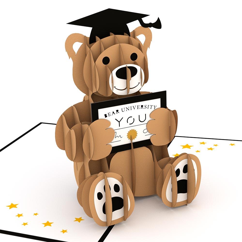 Inside is a pop up Graduation Bear. He's wearing a proud smile on his furry face and dressed in traditional graduation garb. This accomplished pop up bear is even holding a diploma. Yellow star embellishments surround the base of the sculpture.
