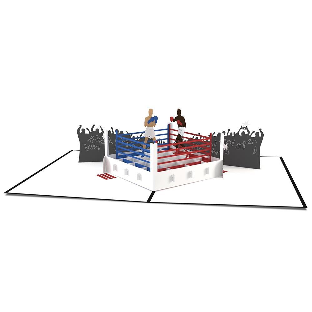 This Boxing pop-up card features bright red boxing gloves set against a bold black cover. This stark image entices the viewer for an epic surprise to come inside the card.