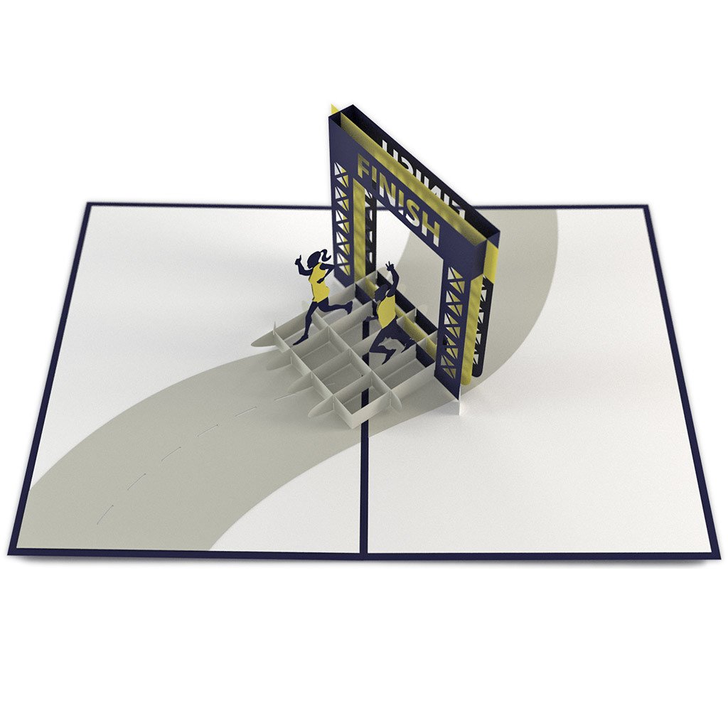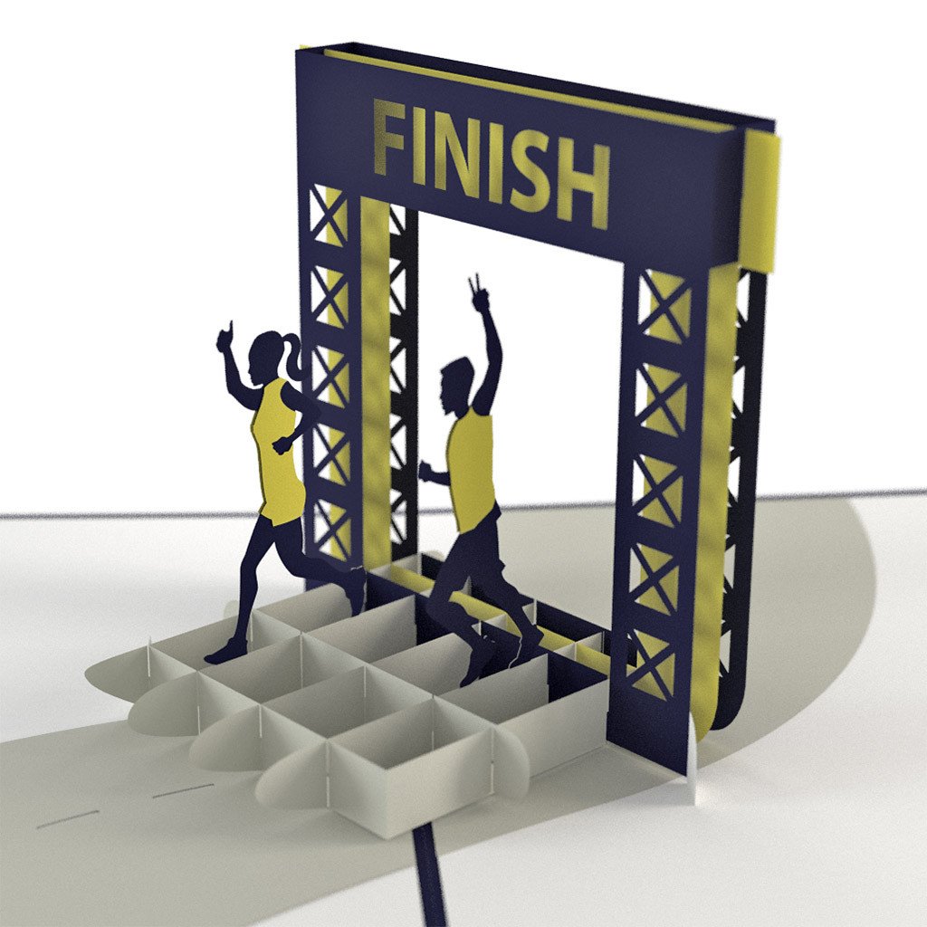 Open the pop-up runner card and an inspiring sight comes to life: a three-dimensional sculpture of a finish line with two runners victoriously crossing the finish line.