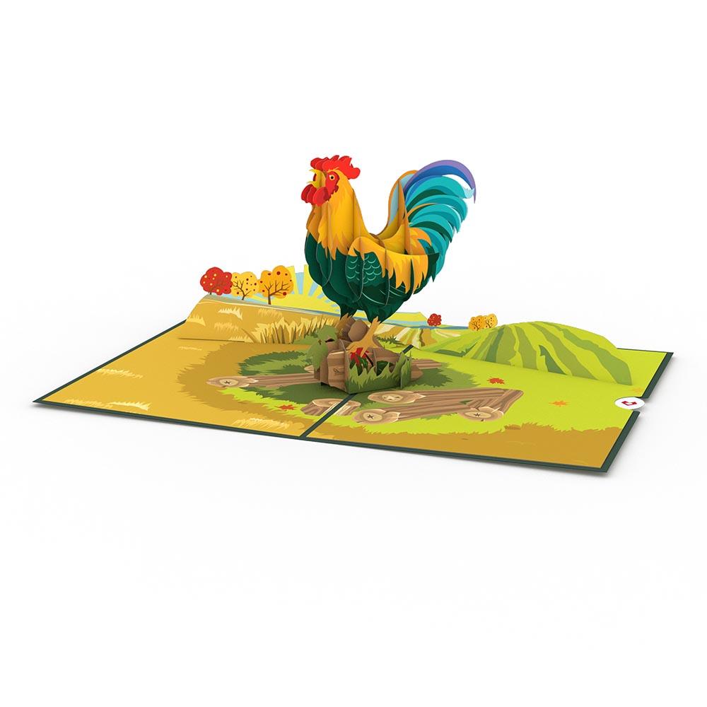 Our designer Trang was inspired by the colorful personality and feathers of Brown Leghorn Roosters. She pictured her Lovepop creation making the unique call of these brilliant barnyard birds. “Every morning, these birds can be seen flapping their wings, raising their necks, and calling their sounds like an alarm clock bell,” she explained. “It signifies the start of a new day!”