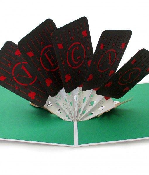 The cover of this pop up card stands out from the crowd all by itself. A 5×7 Ace of Hearts greets you when you first pick it up. Open it to see two hands holding a royal flush in hearts. The cards have black backs which spell out Vegas and are displayed over the green of a poker table.