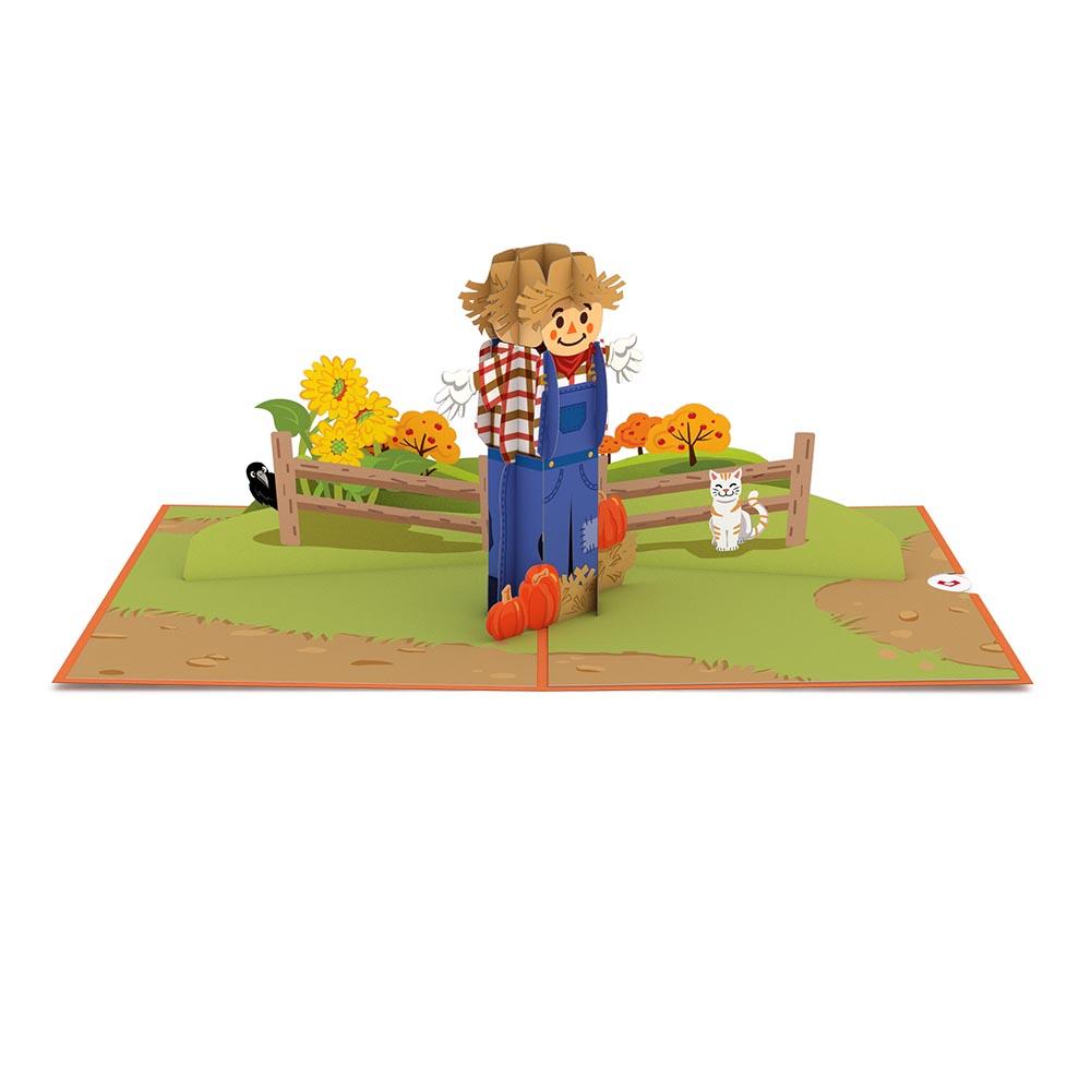 A cheerful, colorful scarecrow smiles behind a sunflower on the front of this bright orange card. Inside, our 3D straw man comes to life wearing a plaid jumper, blue jean overalls, and a tan hat. He stands guard over his plump orange pumpkins while curious companions — a butterscotch kitty and jet black crow — peek closely by in the vividly illustrated farmyard.