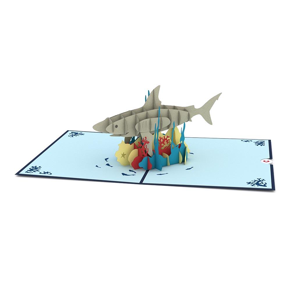 Once opened the card reveals a magnificent three-dimensional paper sculpture of a great white shark atop a coral reef and surrounded by ocean blue paper that is embellished with coral reef and fish designs.
