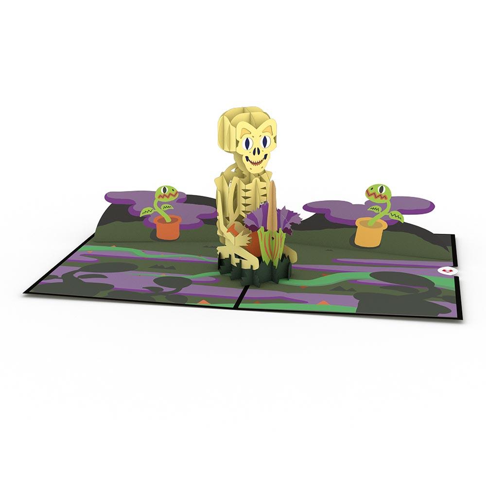 Our Skeleton Groundskeeper smiles on the front of this jet black card, wearing a woven work hat with a violet ribbon. Inside, the skeleton pops to life in 3D, holding a watering can over a purple, yellow, and green Corpse Flower — a stinky but spectacular plant that blooms rarely and for only a moment in time. Our skeleton’s garden grounds are illustrated in shades of deep purple, black, and green with potted Venus flytraps propped up in the background.