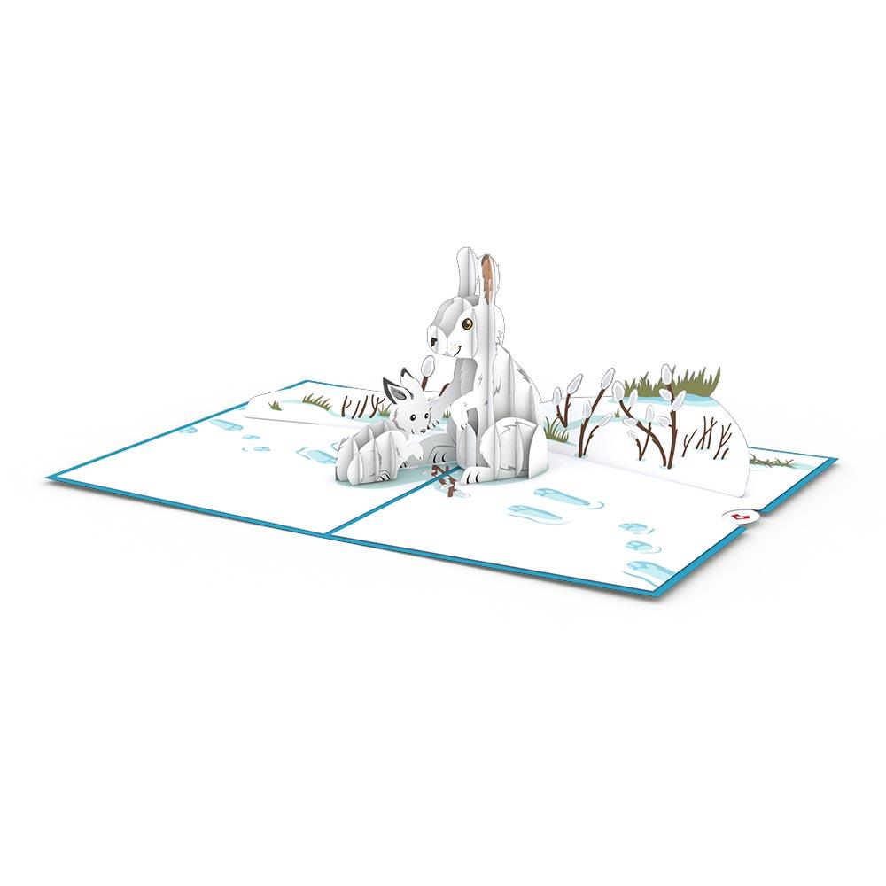 This adorable card features a light blue cover with a laser-cut hare holding a single piece of hay in its mouth. Upon opening the card, a hare and her baby are seen sweetly standing amidst a white, blue and gray snowy backdrop. Footprints surround the pair to suggest that the hare and her youngster were having plenty of wintry fun, bounding through the snow!
