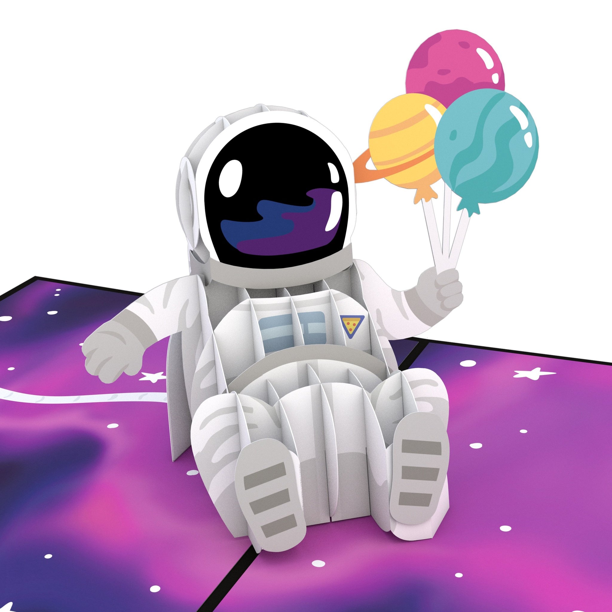The planet Earth smiles while wearing a festive party hat on the front of this black card. Moon and another planet join the party, floating in space, surrounded by dots of white stars. Upon opening this pop-up design, an astronaut appears fully suited up, suspended among the stars. The astronaut holds onto three colorful planet balloons. The background is beautifully illustrated in an astro-blend of pink, purple, and blue.