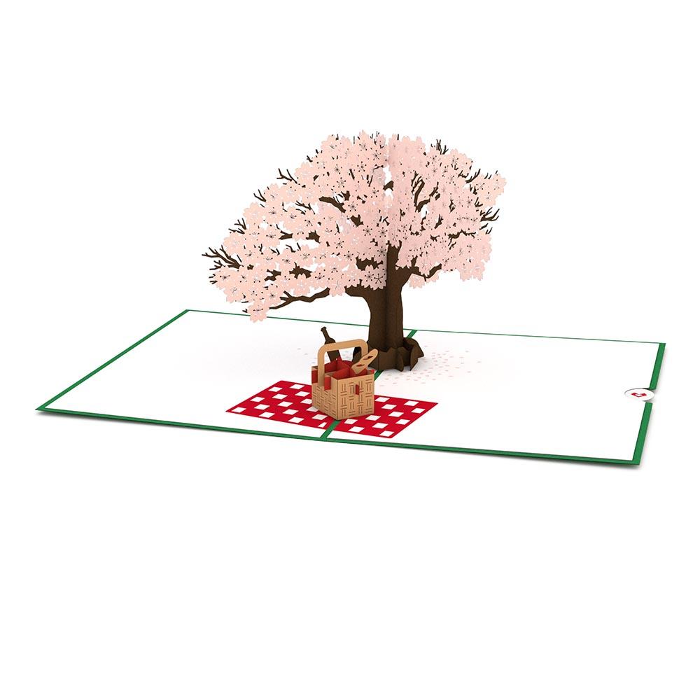 Open this beautiful card to reveal an inviting pop-up scene. A towering Cherry Blossom tree three-dimensional paper sculpture emerges. Underneath the tree is a red and white checkered blanket with a picnic basket holding a bottled beverage and baguette.