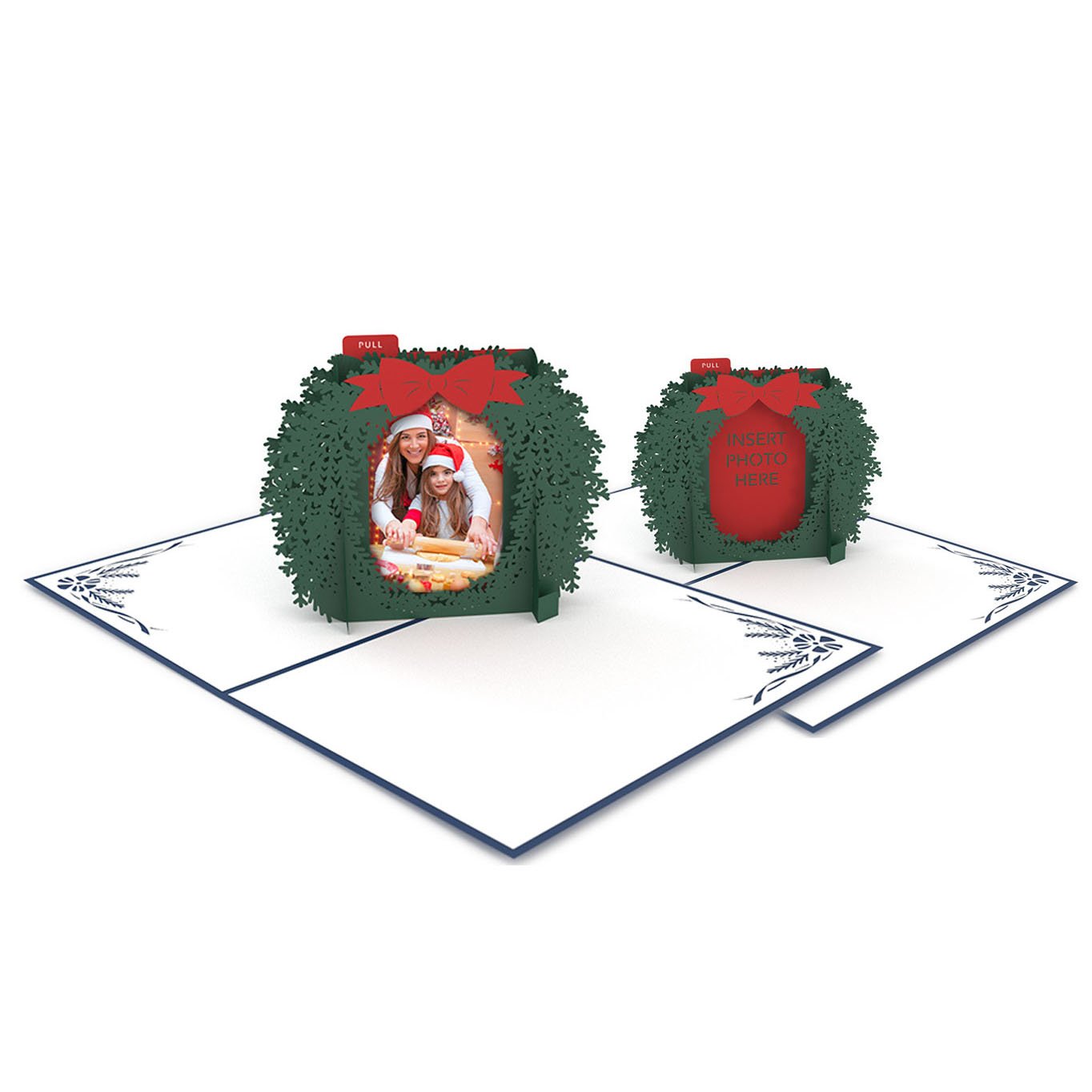 This pop-up card is the perfect Christmas gift. Place your favorite family photo inside the wreath and send to loved ones. This Christmas card is sure to be displayed and admired throughout the holiday season.